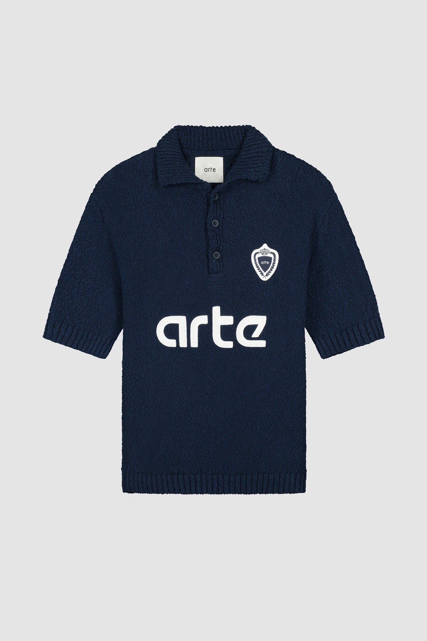 Der Football Knit in Blau von Arte Antwerp ist aus einer hochwertigen Baumwollmischung gefertigt. Das Strickpolo trägt eine sportliche Interpretation des Arte-Logos, großflächig über den Körper gestickt. Auf der linken Brustseite rundet ein athletischer Stick-Patch das Design ab.
