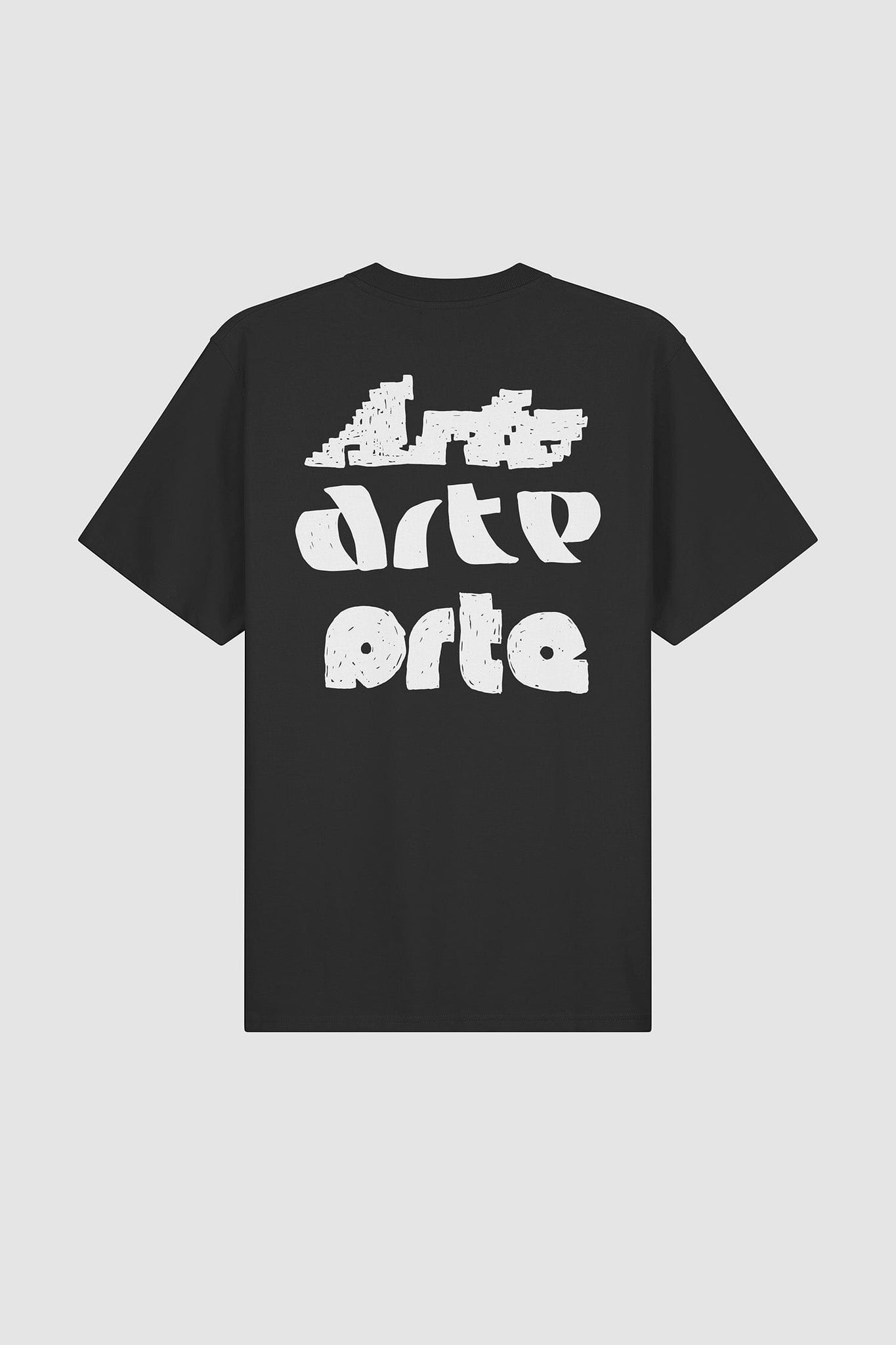 Das Arte T-Shirt ist aus hochwertiger, schwerer Baumwolle gefertigt und fühlt sich weich auf der Haut an. Es verfügt über einen leicht höheren Rundhalsausschnitt und eine lockere Passform. Auf der Rückseite ist ein weißes, screen-printed Artwork aufgebracht, das das Thema der Kollektion aufgreift.
