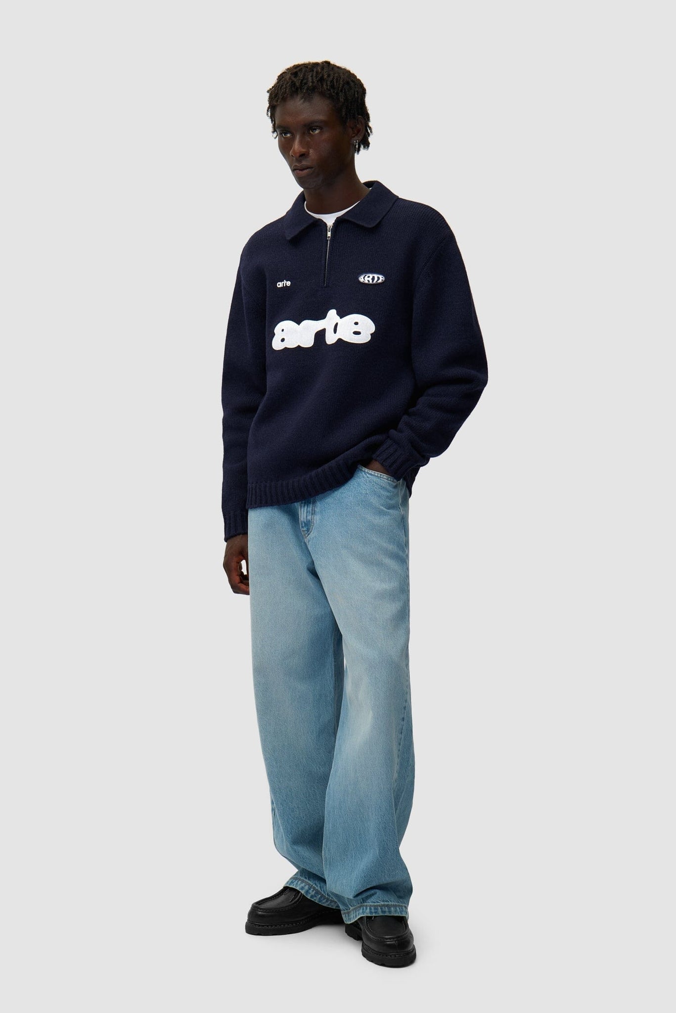 The Arte Quarter-Zip Polo ist ein relaxed-fit Strick-Cardigan aus einem hochwertigen Woll-Mix. In Navy gehalten, eignet sich der Style perfekt als vielseitiges Layering-Piece an kühleren Tagen. Auf der Vorderseite befindet sich das weiß gestickte Arte-Logo.