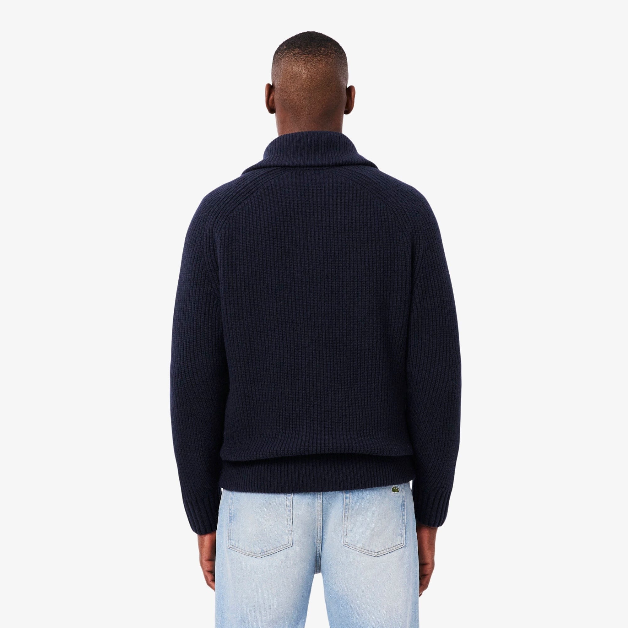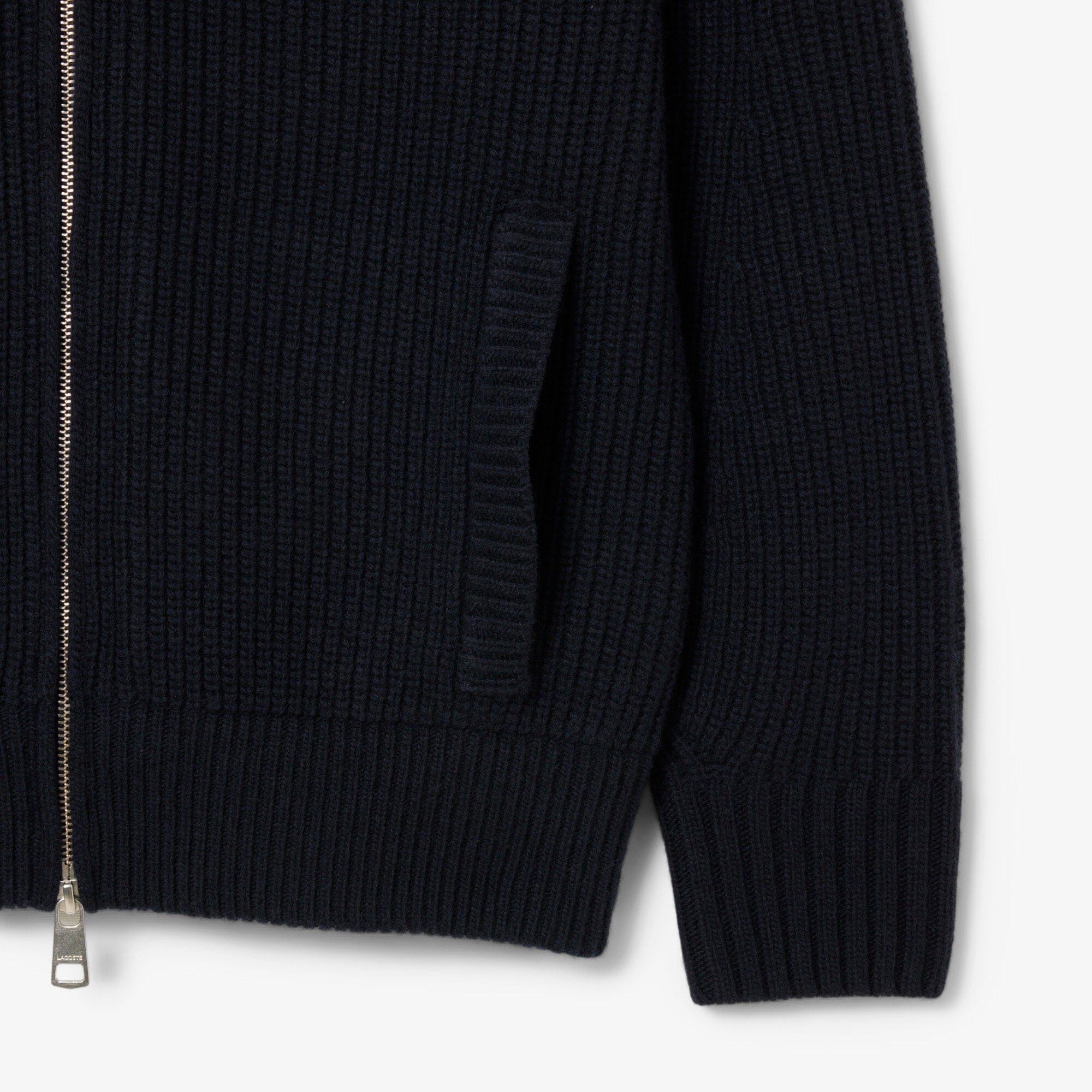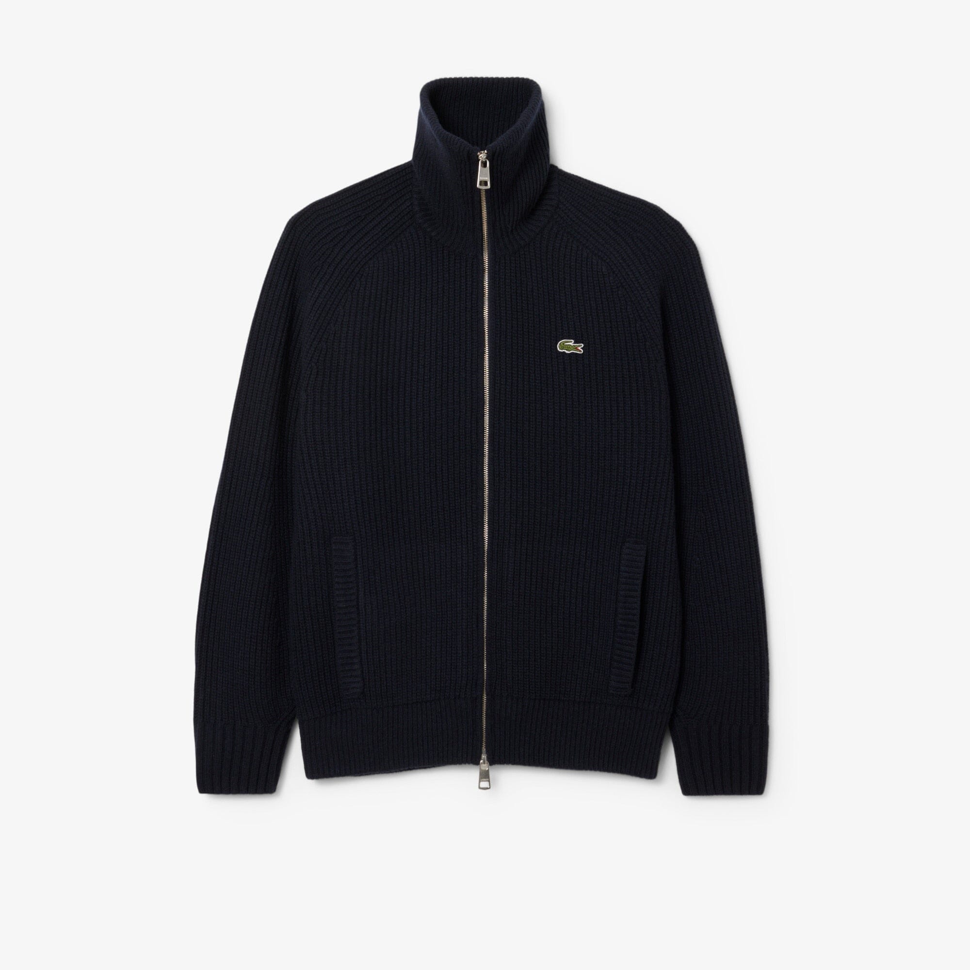 Hochwertiger Pullover mit hohem Kragen aus weicher, warmer Tuchwolle. Der Perlrippstrick sorgt für Struktur, während dezente Schattierungen an den Ärmeln Tiefe verleihen. Der Zwei-Wege-Reißverschluss macht den Style funktional, zwei Seitentaschen bringen Komfort. Das gestickte Krokodil auf der Brust setzt den klassischen Lacoste-Akzent.