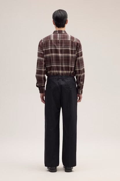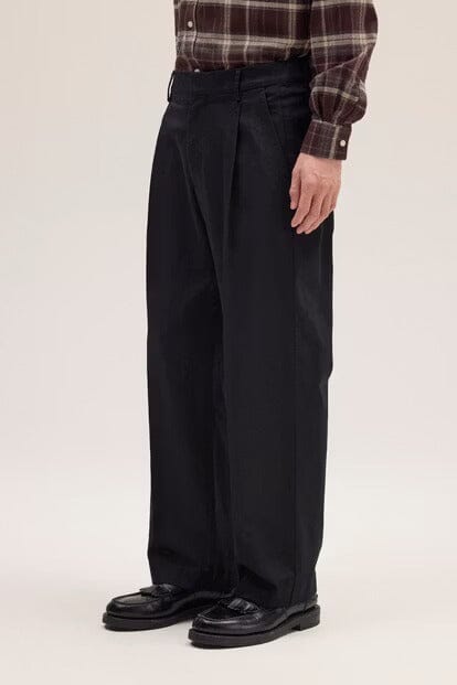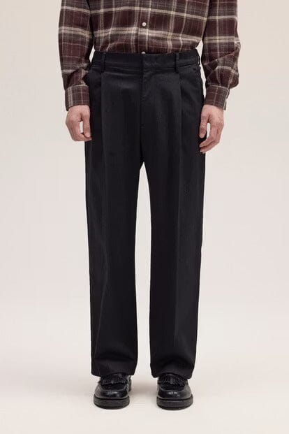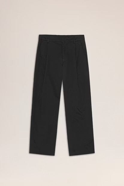 Plissierte Hose im Relaxed Fit aus weicher Bio-Baumwolle (250 g/m²) mit glänzendem Satin-Finish. Doppelbundfalten vorne und ein Haken- und Stegverschluss sorgen für eine klare, drapierte Silhouette.